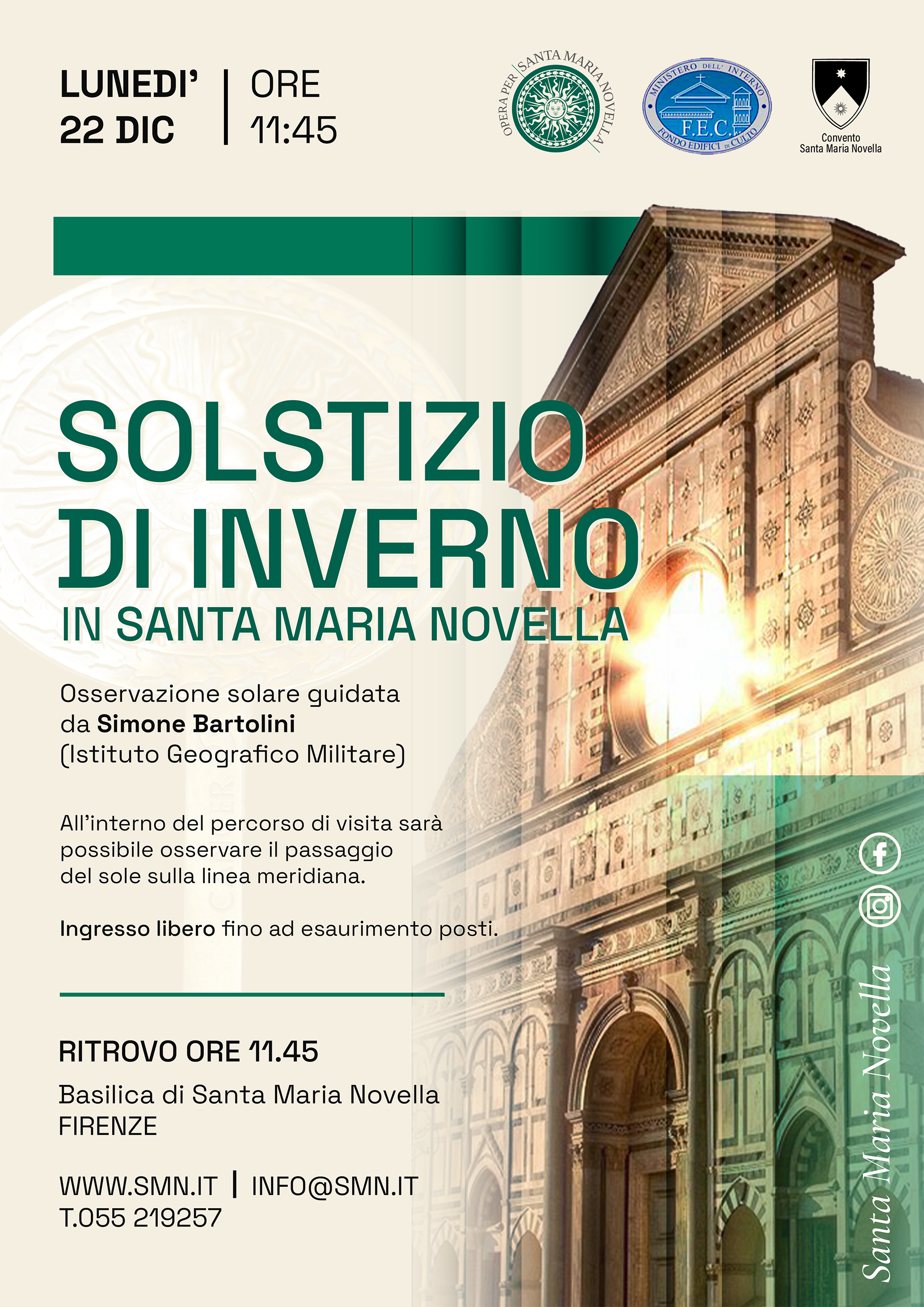 Meeting on 22 December, starting at 11:45 a.m., to discover the meridian lines of Santa Maria Novella with Simone Bartolini (Istituto Geografico Militare) and to observe together the passage of sunlight inside the basilica.