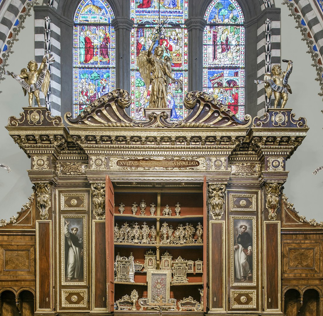 However, this relic cabinet alone is a work of art itself. Modeled, inlaid and painstakingly carved by a master craftsman who used linden wood and the rare Lebanese cedar. A type of plant that at the time grew only on the highest mountains of the eastern Mediterranean. His name was Maestro Lessandro di Luca di Bracci di Pelago who knew well how to work the wood, but not to design it. Behind this precious furnishings, in fact, there is another well-known figure: Bernardo Buontalenti. He personally designed the cabinet for the Dominican friars at the end of the 16th century, who paid in full to its construction and engaged the best artists on the square.