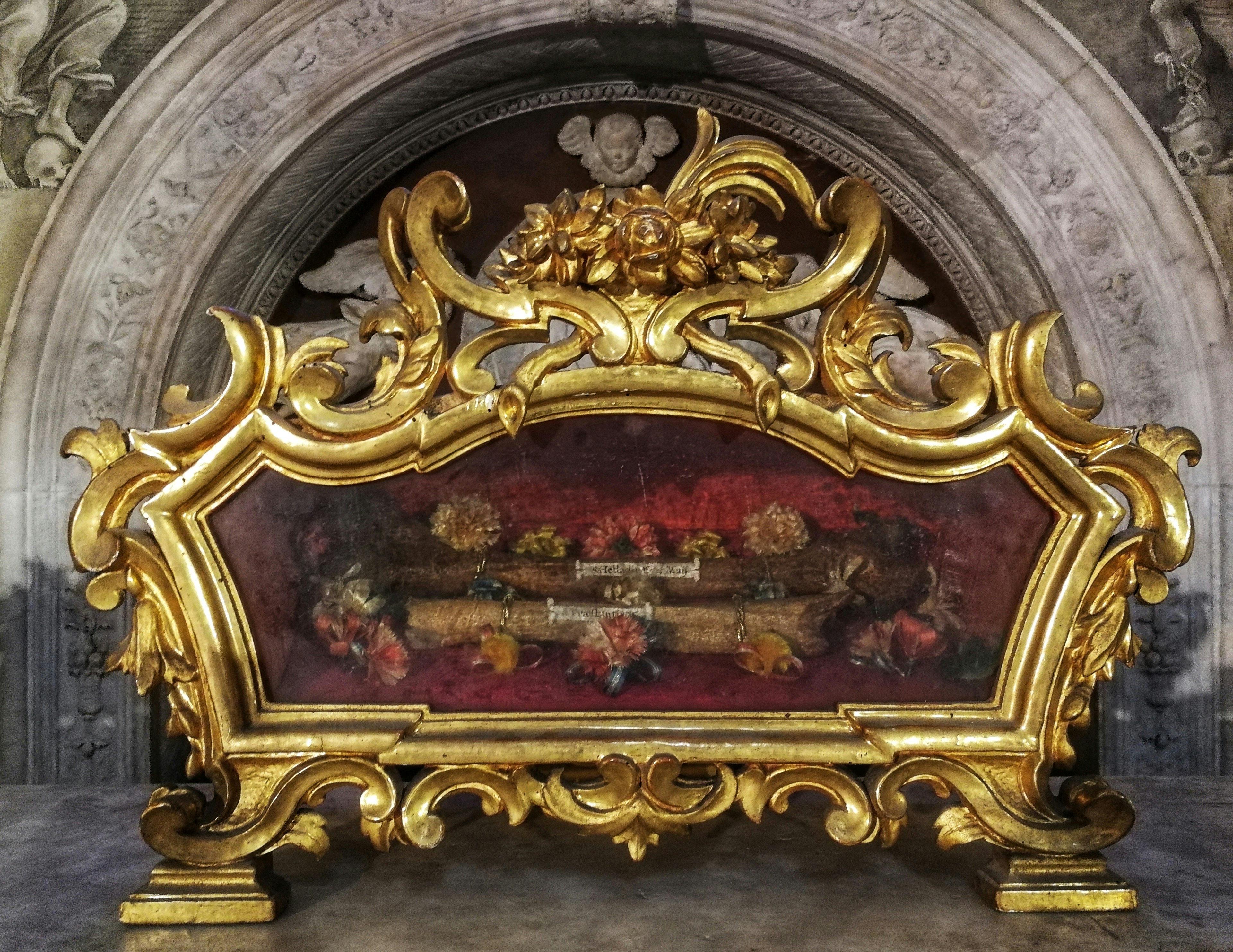 Inside there are containers of different craftship and origin. In the shape of an arm or a hand (like the ancient Roman ex-votos). Cross-shaped or framed by a sumptuous support. In these fine reliquaries small parts of organic tissue, bones and even hair are preserved. They are generally accompanied by a small label indicating the name of the venerated saint. They are the remains of religious and personality figures related to the cult of saints and relics. Amongst these relics there is the mummified finger of St. Thomas Aquinas and St. Peter Martyr, the pastoral stick of St. Vincent Ferrer or St. Anthony's miter.