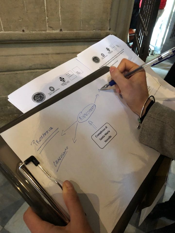 Nel 2018 abbiamo avviato una seconda fase della ricerca in cui sono stato sviluppati e sperimentati nuovi strumenti di dialogo con il pubblico. L’obiettivo in questa fase è stato quello di far emergere, attraverso delle attività specifiche, gli aspetti più emotivi e personali nel rapporto che intercorre tra la Basilica di Santa Maria Novella ed i suoi visitatori. Il risultato è stato quello di poter conoscere nuove prospettive e punti di osservazione sulla percezione diffusa tra il pubblico e la comunità (soprattutto locale) riguardo al complesso domenicano. Questo è stato possibile grazie alle analisi partecipate condotte con dei gruppi di lavoro (o focus group) che hanno permesso di tracciare i pensieri dei nostri volontari con delle mappe concettuali.