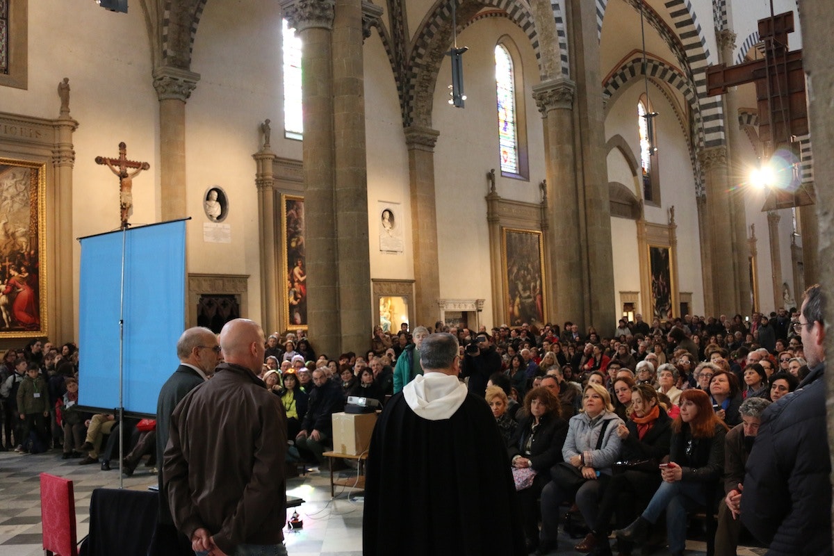 Durante la conferenza a Santa Maria Novella. Padre Daniele Cara introduce l'evento.