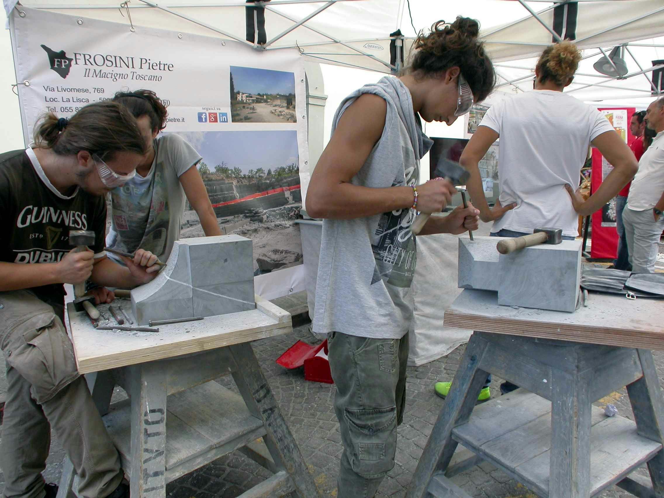 Nei giorni scorsi Piazza Matteotti di Greve in Chianti si è animata da un continuo via vai di persone richiamate dall'evento più importante della stagione: la rassegna dei vini del Chianti Classico. In questo vivace contesto risuonava allo stand della Frosini Pietre il ritmico battere del martello sullo scalpello, un suono cadenzato, immutato da generazioni nella sua semplice essenza, il duro lavoro di scalpellare la Pietra