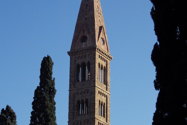 I quattro timpani alla base della cuspide, col tema della croce potenziata, dialogano con le testate del sottostante transetto, un tempo presenti anche sul fronte settentrionale, oltre che con l’ottagonale campanile della Badia.